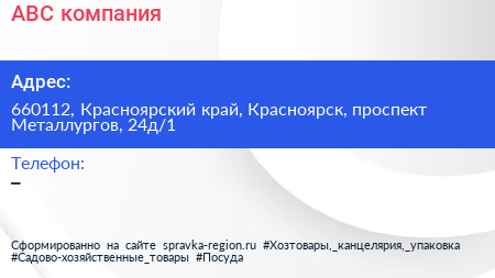 ABC, компания по адресу 660112, Красноярский край, Красноярск, проспект Металлургов, 24д/1 в дальнейшем Организация, размещена в следующих категориях: