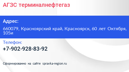 АГЗС терминалнефтегаз по адресу 660079, Красноярский край, Красноярск, 60 лет Октября, 105и в дальнейшем Организация, размещена в следующих категориях: