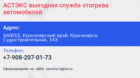АСТЭКС, выездная служба отогрева автомобилей по адресу 660012, Красноярский край, Красноярск, Судостроительная, 143 в дальнейшем Организация, размещена в следующих категориях: