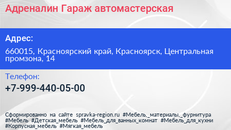 Адреналин Гараж, автомастерская по адресу 660015, Красноярский край, Красноярск, Центральная промзона, 14 в дальнейшем Организация, размещена в следующих категориях: