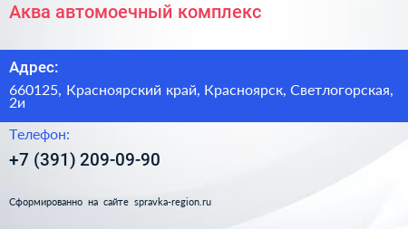Аква, автомоечный комплекс по адресу 660125, Красноярский край, Красноярск, Светлогорская, 2и в дальнейшем Организация, размещена в следующих категориях: