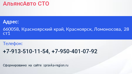 АльянсАвто, СТО по адресу 660058, Красноярский край, Красноярск, Ломоносова, 28 ст1 в дальнейшем Организация, размещена в следующих категориях: