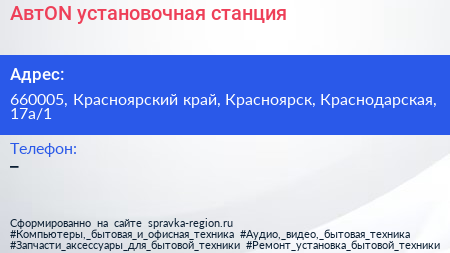 АвтON, установочная станция по адресу 660005, Красноярский край, Красноярск, Краснодарская, 17а/1 в дальнейшем Организация, размещена в следующих категориях: