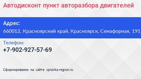 Автодисконт, пункт авторазбора двигателей по адресу 660012, Красноярский край, Красноярск, Семафорная, 191 в дальнейшем Организация, размещена в следующих категориях: