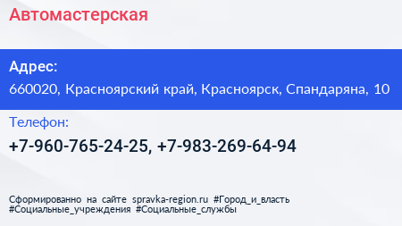 Автомастерская по адресу 660020, Красноярский край, Красноярск, Спандаряна, 10 в дальнейшем Организация, размещена в следующих категориях: