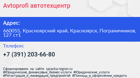Avtoprofi, автотехцентр по адресу 660055, Красноярский край, Красноярск, Пограничников, 127 ст1 в дальнейшем Организация, размещена в следующих категориях:
