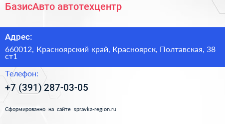 БазисАвто, автотехцентр по адресу 660012, Красноярский край, Красноярск, Полтавская, 38 ст1 в дальнейшем Организация, размещена в следующих категориях: