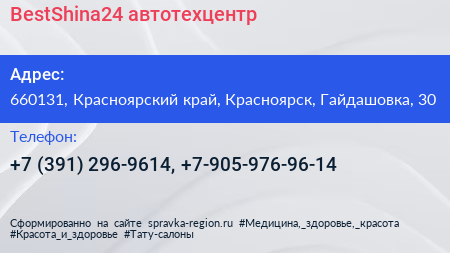 BestShina24, автотехцентр по адресу 660131, Красноярский край, Красноярск, Гайдашовка, 30 в дальнейшем Организация, размещена в следующих категориях:
