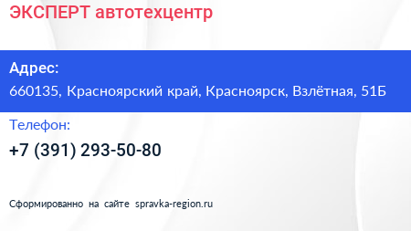 ЭКСПЕРТ, автотехцентр по адресу 660135, Красноярский край, Красноярск, Взлётная, 51Б в дальнейшем Организация, размещена в следующих категориях: