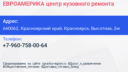ЕВРОАМЕРИКА, центр кузовного ремонта по адресу 660062, Красноярский край, Красноярск, Высотная, 2ж в дальнейшем Организация, размещена в следующих категориях: