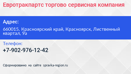 Евротракпартс, торгово-сервисная компания по адресу 660015, Красноярский край, Красноярск, Лиственный квартал, 9а в дальнейшем Организация, размещена в следующих категориях: