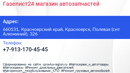 Газелист24, магазин автозапчастей по адресу 660131, Красноярский край, Красноярск, Полевая (снт Алюминий), 326 в дальнейшем Организация, размещена в следующих категориях: