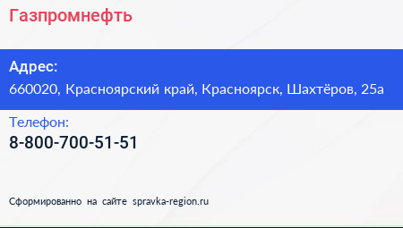 Газпромнефть по адресу 660020, Красноярский край, Красноярск, Шахтёров, 25а в дальнейшем Организация, размещена в следующих категориях: