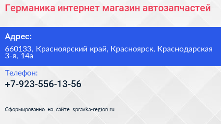 Германика, интернет-магазин автозапчастей по адресу 660133, Красноярский край, Красноярск, Краснодарская 3-я, 14а в дальнейшем Организация, размещена в следующих категориях: