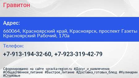 Гравитон по адресу 660064, Красноярский край, Красноярск, проспект Газеты Красноярский Рабочий, 170а в дальнейшем Организация, размещена в следующих категориях: