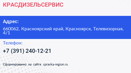 КРАСДИЗЕЛЬСЕРВИС по адресу 660062, Красноярский край, Красноярск, Телевизорная, 4/1 в дальнейшем Организация, размещена в следующих категориях:
