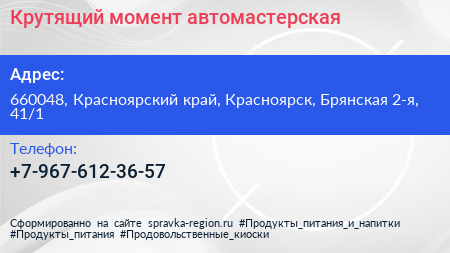 Крутящий момент, автомастерская по адресу 660048, Красноярский край, Красноярск, Брянская 2-я, 41/1 в дальнейшем Организация, размещена в следующих категориях: