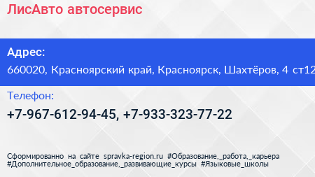 ЛисАвто, автосервис по адресу 660020, Красноярский край, Красноярск, Шахтёров, 4 ст12 в дальнейшем Организация, размещена в следующих категориях: