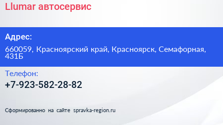 Llumar, автосервис по адресу 660059, Красноярский край, Красноярск, Семафорная, 431Б в дальнейшем Организация, размещена в следующих категориях: