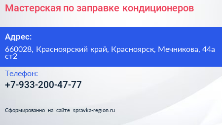 Мастерская по заправке кондиционеров по адресу 660028, Красноярский край, Красноярск, Мечникова, 44а ст2 в дальнейшем Организация, размещена в следующих категориях: