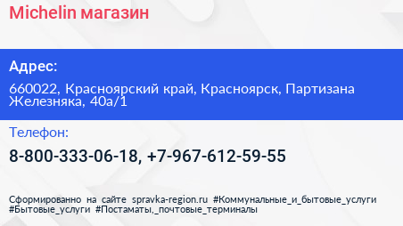 Michelin, магазин по адресу 660022, Красноярский край, Красноярск, Партизана Железняка, 40а/1 в дальнейшем Организация, размещена в следующих категориях: