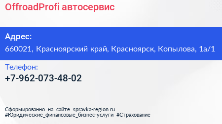 OffroadProfi, автосервис по адресу 660021, Красноярский край, Красноярск, Копылова, 1а/1 в дальнейшем Организация, размещена в следующих категориях:
