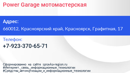 Power Garage, мотомастерская по адресу 660012, Красноярский край, Красноярск, Графитная, 17 в дальнейшем Организация, размещена в следующих категориях: