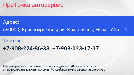 ПроТочка, автосервис по адресу 660003, Красноярский край, Красноярск, Новая, 62а ст2 в дальнейшем Организация, размещена в следующих категориях: