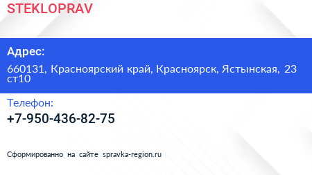 STEKLOPRAV по адресу 660131, Красноярский край, Красноярск, Ястынская, 23 ст10 в дальнейшем Организация, размещена в следующих категориях: