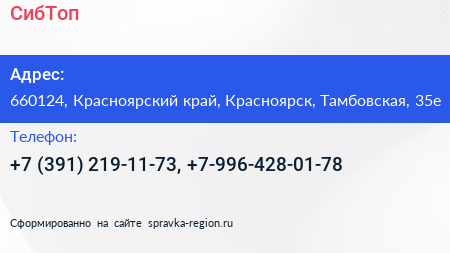 СибТоп по адресу 660124, Красноярский край, Красноярск, Тамбовская, 35е в дальнейшем Организация, размещена в следующих категориях:
