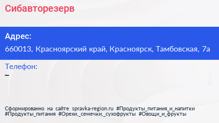 Сибавторезерв по адресу 660013, Красноярский край, Красноярск, Тамбовская, 7а в дальнейшем Организация, размещена в следующих категориях: