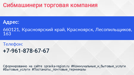 Сибмашинери, торговая компания по адресу 660121, Красноярский край, Красноярск, Лесопильщиков, 163 в дальнейшем Организация, размещена в следующих категориях: