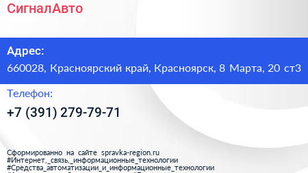 СигналАвто по адресу 660028, Красноярский край, Красноярск, 8 Марта, 20 ст3 в дальнейшем Организация, размещена в следующих категориях: