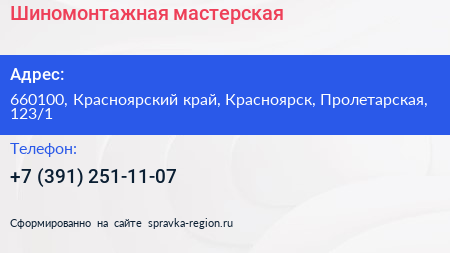 Шиномонтажная мастерская по адресу 660100, Красноярский край, Красноярск, Пролетарская, 123/1 в дальнейшем Организация, размещена в следующих категориях: