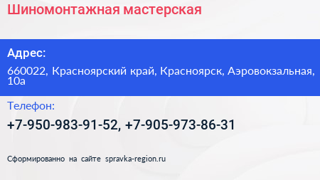 Шиномонтажная мастерская по адресу 660022, Красноярский край, Красноярск, Аэровокзальная, 10а в дальнейшем Организация, размещена в следующих категориях:
