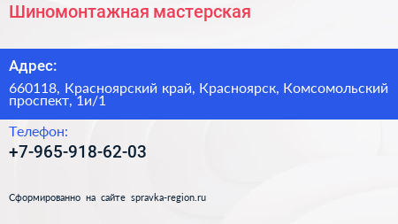 Шиномонтажная мастерская по адресу 660118, Красноярский край, Красноярск, Комсомольский проспект, 1и/1 в дальнейшем Организация, размещена в следующих категориях: