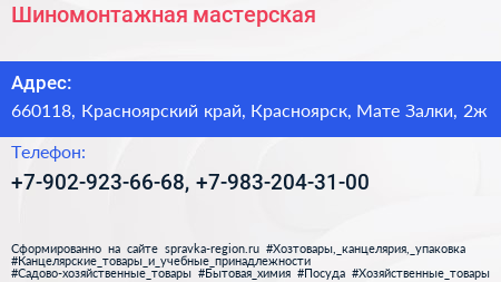 Шиномонтажная мастерская по адресу 660118, Красноярский край, Красноярск, Мате Залки, 2ж в дальнейшем Организация, размещена в следующих категориях: