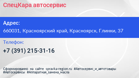 СпецКара, автосервис по адресу 660031, Красноярский край, Красноярск, Глинки, 37 в дальнейшем Организация, размещена в следующих категориях: