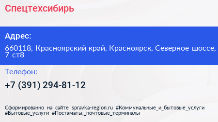 Спецтехсибирь по адресу 660118, Красноярский край, Красноярск, Северное шоссе, 7 ст8 в дальнейшем Организация, размещена в следующих категориях: