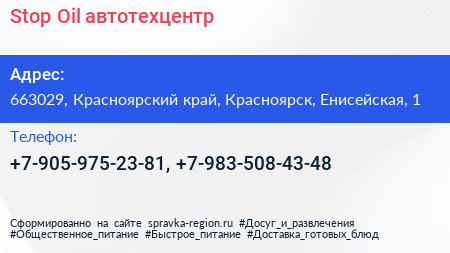 Stop Oil, автотехцентр по адресу 663029, Красноярский край, Красноярск, Енисейская, 1 в дальнейшем Организация, размещена в следующих категориях: