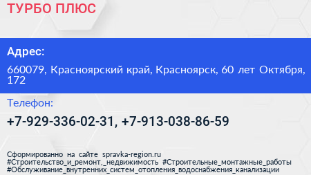 ТУРБО ПЛЮС по адресу 660079, Красноярский край, Красноярск, 60 лет Октября, 172 в дальнейшем Организация, размещена в следующих категориях: