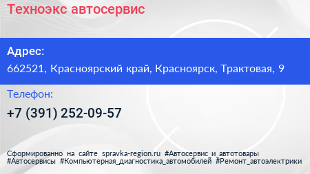 Техноэкс, автосервис по адресу 662521, Красноярский край, Красноярск, Трактовая, 9 в дальнейшем Организация, размещена в следующих категориях: