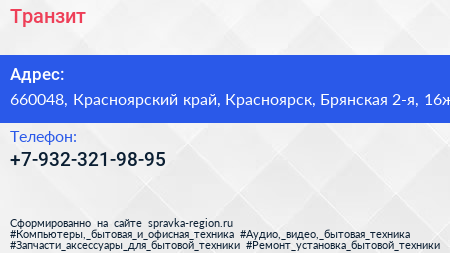 Транзит по адресу 660048, Красноярский край, Красноярск, Брянская 2-я, 16ж в дальнейшем Организация, размещена в следующих категориях:
