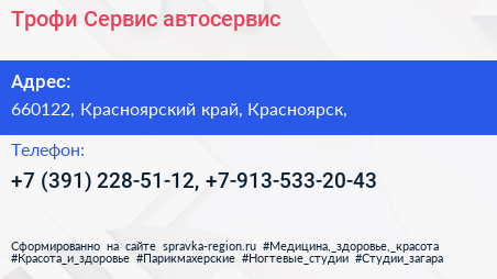 Трофи-Сервис, автосервис по адресу 660122, Красноярский край, Красноярск, в дальнейшем Организация, размещена в следующих категориях: