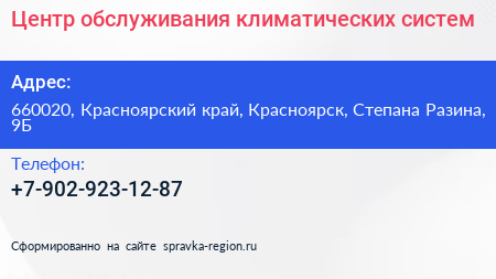 Центр обслуживания климатических систем по адресу 660020, Красноярский край, Красноярск, Степана Разина, 9Б в дальнейшем Организация, размещена в следующих категориях: