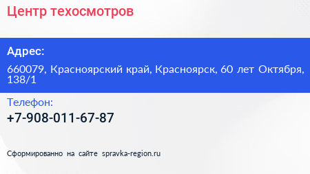 Центр техосмотров по адресу 660079, Красноярский край, Красноярск, 60 лет Октября, 138/1 в дальнейшем Организация, размещена в следующих категориях: