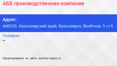 АББ, производственная компания по адресу 660135, Красноярский край, Красноярск, Взлётная, 5 ст1 в дальнейшем Организация, размещена в следующих категориях: