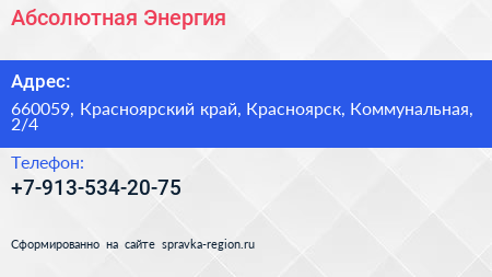 Абсолютная Энергия по адресу 660059, Красноярский край, Красноярск, Коммунальная, 2/4 в дальнейшем Организация, размещена в следующих категориях: