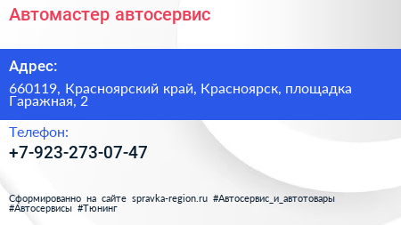 Автомастер, автосервис по адресу 660119, Красноярский край, Красноярск, площадка Гаражная, 2 в дальнейшем Организация, размещена в следующих категориях: