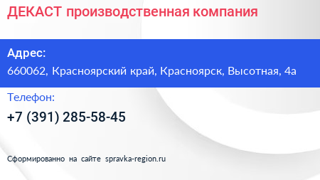 ДЕКАСТ, производственная компания по адресу 660062, Красноярский край, Красноярск, Высотная, 4а в дальнейшем Организация, размещена в следующих категориях:
